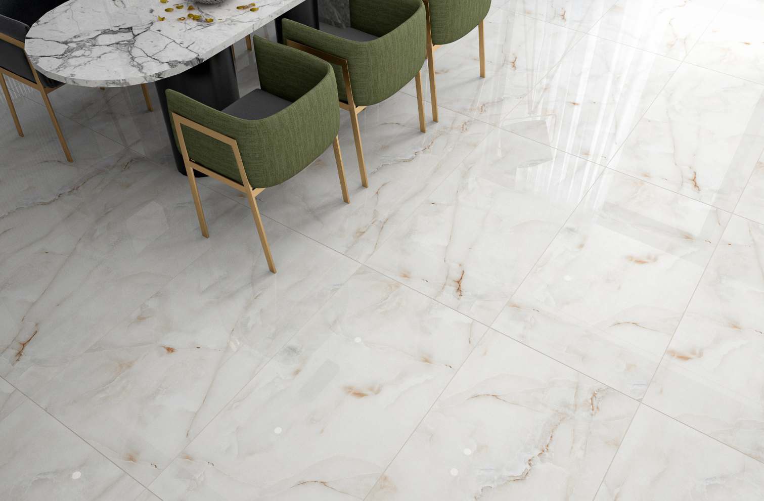 Glaze Vitrified Tiles ( GVT ) or Porcelain Tile is widely use nowadays as Floor tile as well as Wall Tiles. Most Popular size is 60x120 cm which can be used with other matching tile to give your space a lavish look. Glossy Collection is made with the best of most loved Statuario, Onyx, Calcutta and other Marbles !